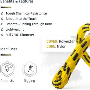24-Strand 7/16 in (11 mm) -24™ Arborist Rope – 5,400 lb MBS – Static Climbing Rope – Lightweight – Arborist – 120 Ft – Tight Spliced Eye – Yellow Black